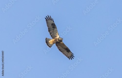 Obraz premium Rough-legged buzzard (buteo lagopus) soaring in the clear blue sky, its wings spread wide.