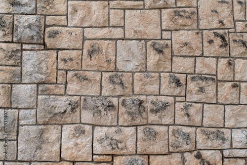 Fototapeta premium Rough limestone block wall texture with dark mortar joint