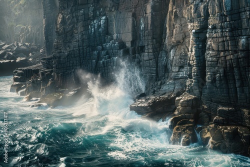 Naklejka premium Rough Ocean Waves Crashing Against Jagged Sea Cliffs