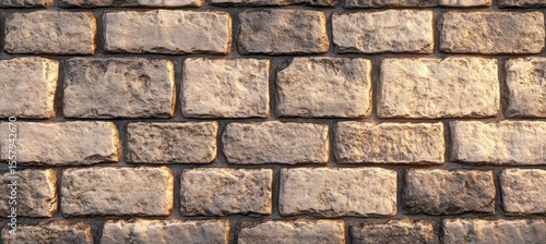 Naklejka premium rough stone brick wall illuminated by warm sunlight showing texture and pattern of rectangular blocks