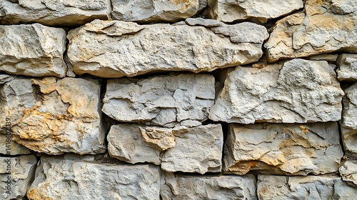 Fototapeta premium Rough stone wall texture with stacked natural rocks in rustic construction pattern background