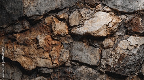 Fototapeta premium Rough stone wall with mixed colored rocks, textures and varied sizes