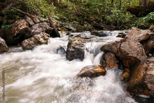 © Marat Demenin, Obraz premium rough stony river in the mountains in the forest