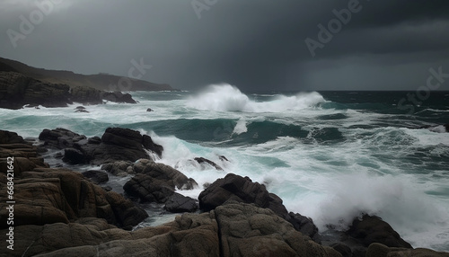 © Stockgiu, Obraz premium Rough surf crashes against rocky coastline in dramatic storm weather generated by AI