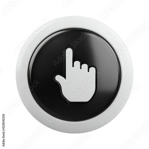© Prichachai, Obraz premium Round button with hand icon pointing upwards is depicted, featuring glossy black center and white border, symbolizing interaction or selection