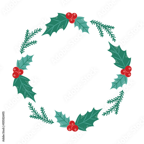 © plaksik13, Naklejka premium Round Christmas Frame with holly. Winter frame with empty space for text. Christmas and New Year. Isolated vector illustration.