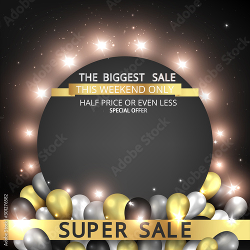 Naklejka premium Round empty frame with realistic elegant balloons with tinsel and bokeh decoration