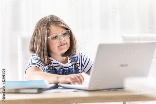 © weyo, Fototapeta premium Round-faced girl wearing glasses sits behind a laptop looking into it