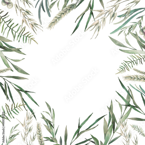 © ldinka, Fototapeta premium Round floral frame. Watercolor greeting card design with green leaves and branches isolated on white background. Eucalyptus, fern plants illustration