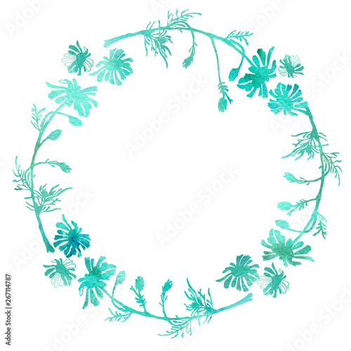 Naklejka premium Round frame of flowers, chamomile. Watercolor drawing with a contour stroke...