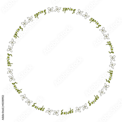 © Asahihana, Obraz premium Round frame with spring flowers on white background. Doodle style. Vector image.