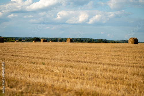 Fototapeta premium Round hay bales on a mowed field under a cloudy blue sky