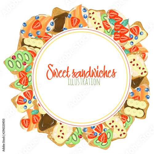 © nastyasklyarova, Fototapeta premium Round logo template of sweet sandwiches, hand drawn on a white background