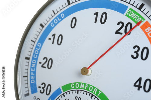 © New Africa, Fototapeta premium Round mechanical hygrometer on white background, closeup. Meteorological tool