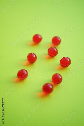 Obraz premium Round red vitamins on a green table