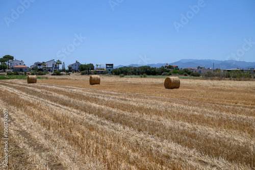Fototapeta premium Round straw bales in a dry Mediterranean field with blue sky in Cyprus.