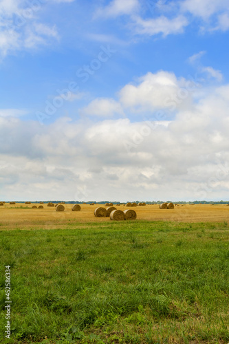 © Aliaksei, Obraz premium Round straw bales in harvested fields and blue sky with clouds.