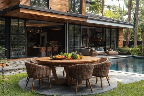 © JIALU, Fototapeta premium Round teak dining table with six chairs, fresh salad, and modern garden furniture by the pool on a summer day.
