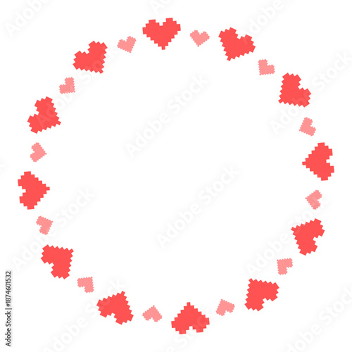 © Ekaterina Chemakina, Obraz premium Round vector frame made of red and pink pixel hearts. Love frame design. Vector 8bit pixel illustration. Decorative heart template