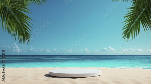 Obraz premium Round White Podium on Tropical Sandy Beach with Turquoise Ocean and Palm...