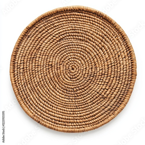 Fototapeta premium Round woven seagrass tray, handcrafted, natural texture, isolated on white background.