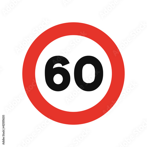 Fototapeta premium Rounded traffic signal in white and red, isolated on white background. Speed limit of sixty