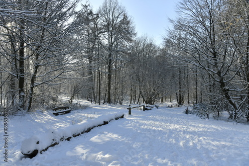 © Photocolorsteph, Naklejka premium Route ombragée sous la neige en forêt de Soignes à Woluwe-Saint Pierre (Bruxelles)