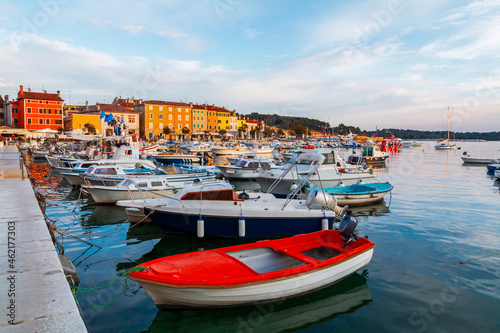 Fototapeta premium Rovinj cozy little seaside old town with harbor on the Istrian peninsula in Adriatic sea at sunset