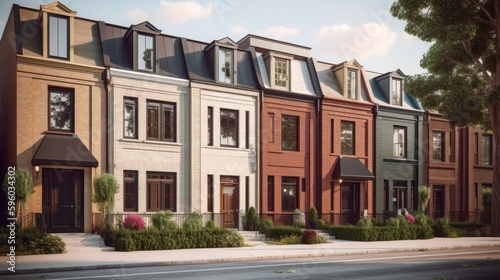 © Hixel, Fototapeta premium Row exterior house design in daytime golden hour generative ai