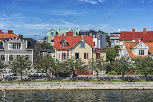 Obraz premium Row of ancient colorful wooden houses in the city of Karlskrona, Sweden