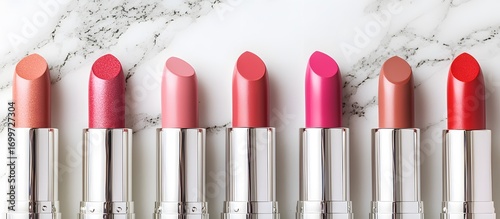 Obraz premium Row of assorted pink and red lipsticks with a marble background