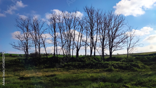 © Jorgarsan, Fototapeta premium Row of bare trees standing in green field under blue sky