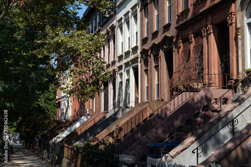 © James, Fototapeta premium Row of Beautiful Old Brownstone Homes in Prospect Heights Brooklyn of New York City along the Sidewalk