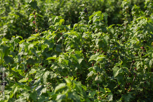 Obraz premium Row of blackcurrant bushes on a summer farm in sunny day. Location place of...