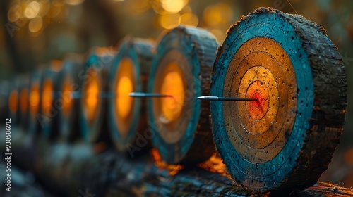 Obraz premium Row of circular archery targets: precision in aiming, hitting the center, and...