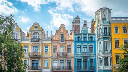 © Abdul, Fototapeta premium Row of colorful historic buildings under a partly cloudy sky