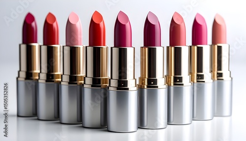 © ULFATRAZA, Obraz premium Row of Colorful Lipsticks in Metallic Cases on White Background.