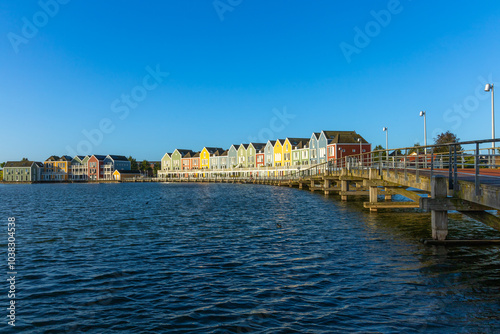 © PixelBiss, Obraz premium Row of colorful modern houses and bridge