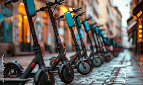Obraz premium Row of electric scooters parked neatly along the sidewalk in a bustling...