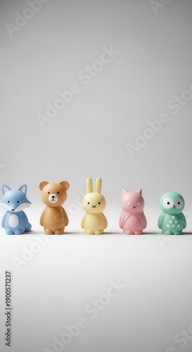 © Ariestia, Obraz premium Row of five stylized, simplified animal figures arranged on a pale surface