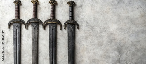 © Giovanni, Fototapeta premium Row of four antique swords displayed on a textured gray background with ample Copy Space for text placement