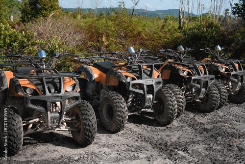 Fototapeta premium Row of four-wheeler all-terrain vehicles parked on a dirt road