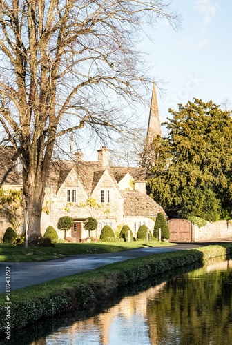 © Pez Photography/Wirestock Creators, Fototapeta premium Row of historic quintessential Cotswold cottages by a river in Cotswolds, England, vertical shot