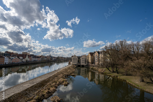 Fototapeta premium Row of houses on the branch of the Danube in Regensburg
