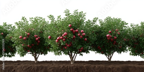 Obraz premium Row of lush apple trees laden with ripe red fruit in orchard