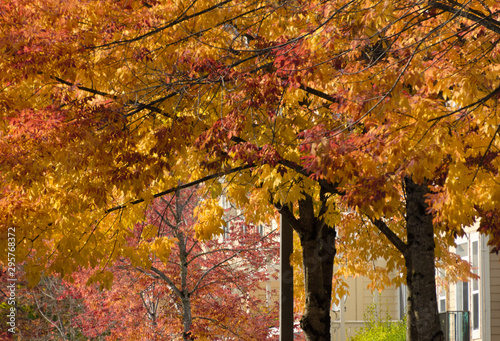 Obraz premium Row of maples and elms with brown and yellow foliage