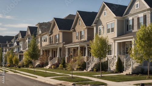 Obraz premium Row of modern suburban houses with trees lining street.