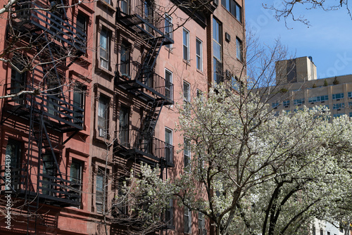 © James, Fototapeta premium Row of Old Brick Residential Buildings on the Upper East Side of New York City with Fire Escapes and Flowering Trees during Spring