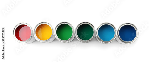 © New Africa, Naklejka premium Row of paint cans on white background, top view