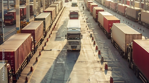 Fototapeta premium Row of parked trucks in warehouse.